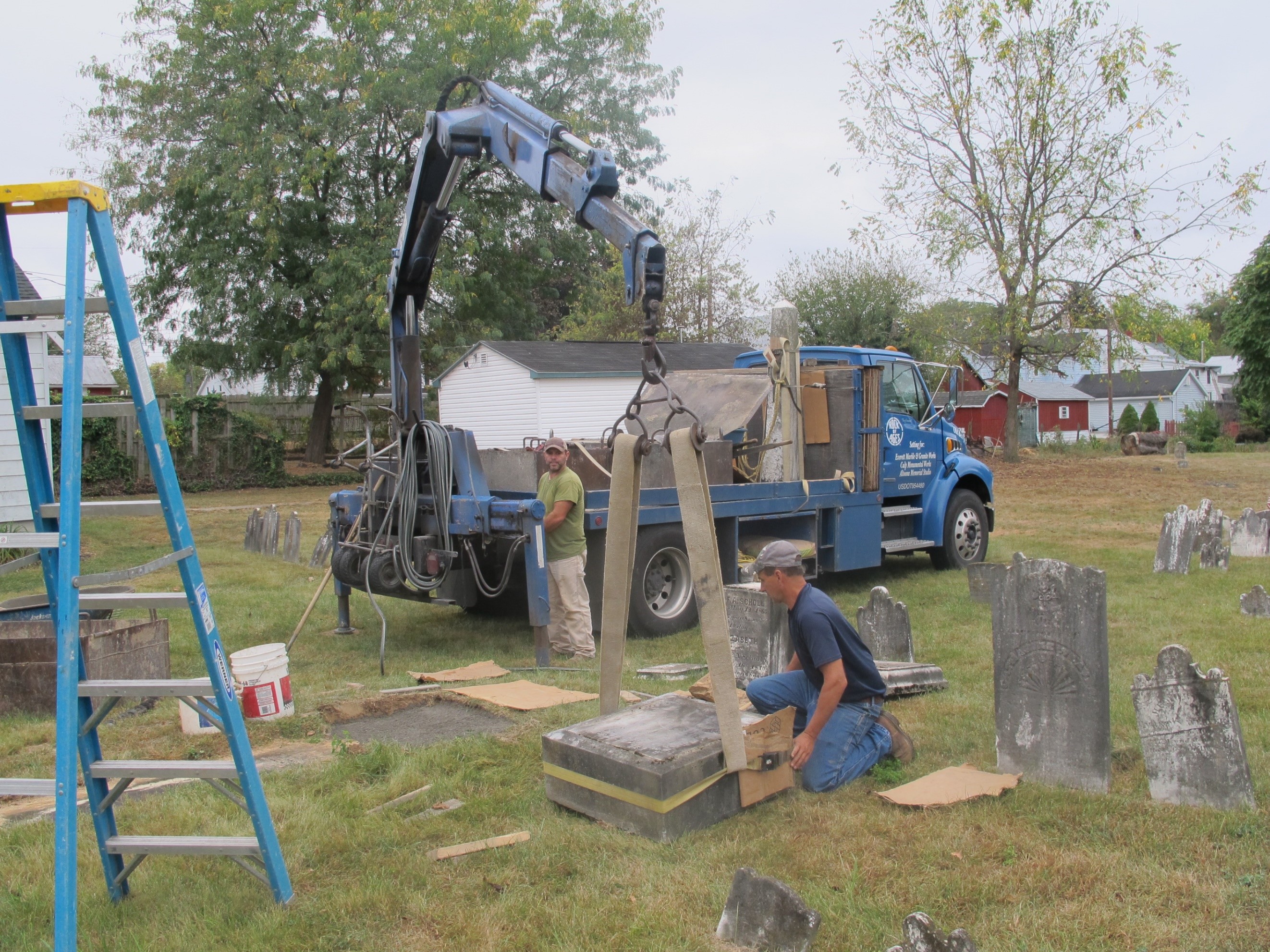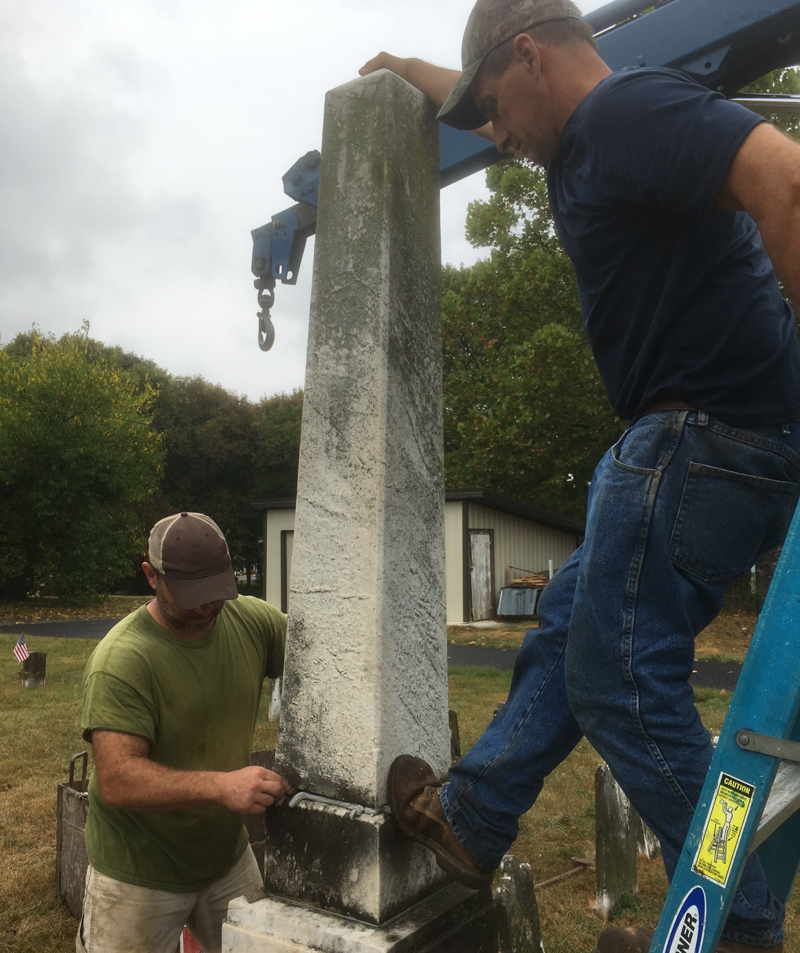 Both obelisks were leaning at a dangerous angle and the spires needed to be leveled and straightened to keep them from falling. Each monument weighs about 1,000 pounds and erected in the 1860s. The workmen, Dennis Shaw and associate Charles “Chuck” Miller, of Shull-Koontz were prompt and professional,” said Jack Webb, volunteer cemetery caretaker. They disassembled each spire into its original three to five pieces. After the stones were disassembled and placed in a safe place, each foundation was leveled and repaired. “Then came the tricky part,” Jack added, “when each piece was cleaned, restacked, leveled and adjoining edges were sealed to the piece below it. And, finally the tall spire was hoisted into place with the precision of a jeweler!”