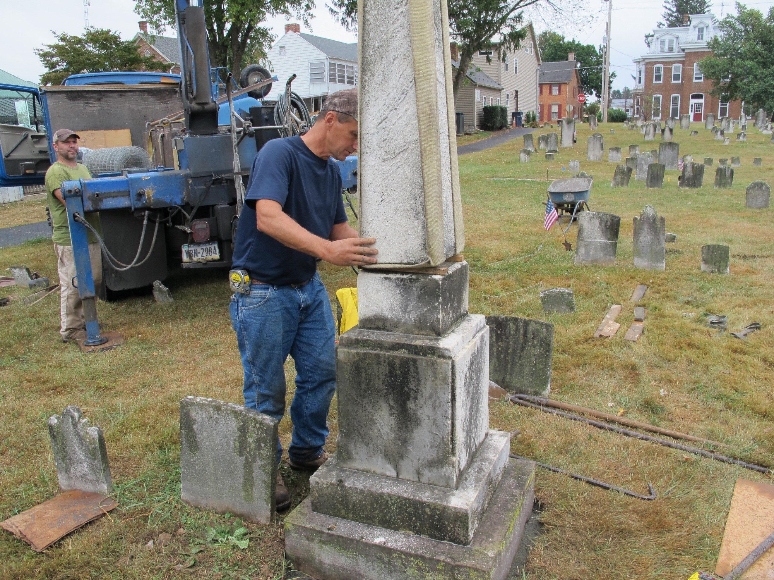 On Monday, October 1, 2019 Grace United Church of Christ (UCC), continued its preservation program for the German Reformed Cemetery (established 1786) on S. Carlisle St. Shull-Koontz Memorials of Chambersburg was contracted to repair the two impressive marble obelisks in the cemetery. One was for Reverend F. A. Scholl and his wife Elizabeth and the other was for Mr. Adam Shirey and his wife Elizabeth. Rev. Scholl was the pastor for the German Reformed Church (now Grace UCC) from 1818 to 1833 and helped to transition the church from the German language to English. The other obelisk is for Mr. Shirey and his wife Elizabeth; he was a prosperous wagon maker and lived near Greencastle and was a neighbor to Rev. Scholl.