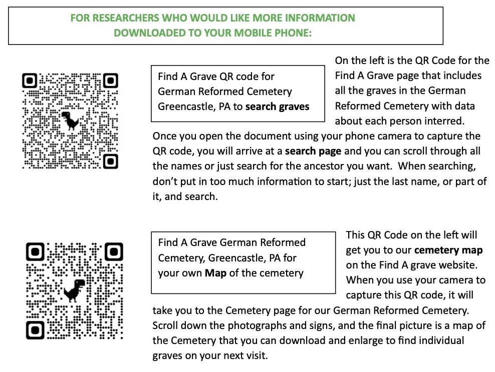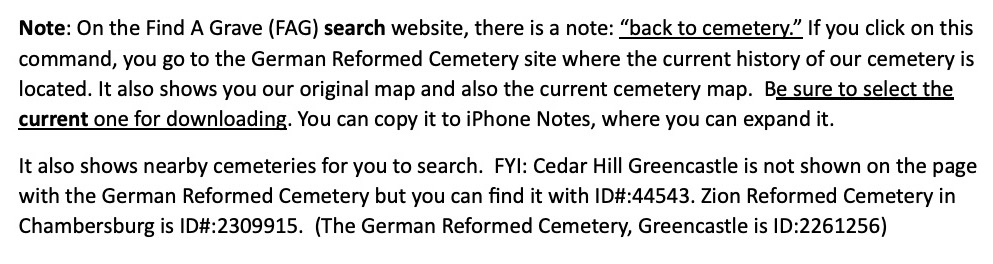 Grace UCC is committed to preserving this Greencastle landmark for future generations to learn and enjoy; as well as for the remembrance of our town’s ancestors. Already completed is the map of the cemetery showing each grave, a book listing each headstone with its map location, and a listing of all graves that have been removed over the years to be interred at Cedar Hills Cemetery with other later deceased relatives. A sign has been installed on the back of the German Reformed Cemetery sign on S. Carlisle St listing the name on almost all the 300+ headstone and a map to find its location. (See Echo Pilot, April18, 2019 https://www.echo-pilot.com/news/20190418/german-reformed-cemetery-is-mapped-and-documented.) The cemetery and names are listed in the Find a Grave database; listed with the Pennsylvania Bureau of Historic Preservation – Cemetery in Harrisburg, PA; and added to library of the Church of Jesus Christ of Latter-day Saints in Salt Lake City. Future plans for the cemetery include a change 1 to the Cemetery research book and straightening headstones and repairing broken stones.